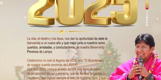 Ene12025Notas de prensa Categoría: Notas de prensaPor Royer Tito1 de enero de 2025 Share this post Share on FacebookShare on Facebook TweetShare on Twitter TweetShare on Pinterest Share on LinkedInShare on LinkedIn Autor: Royer Tito Navegación entre publicacionesAnteriorPublicación anterior:Feliz Navidad y un venturoso Año 2025SiguientePublicación siguiente:MUNICIPALIDAD DE LAMPA RINDE HOMENAJE A JUAN BUSTAMANTE DUEÑAS EN EL 157.º ANIVERSARIO DE SU FALLECIMIENTORelated postsRESULTADOS FINALES DEL CONCURSO DE WAPULULOS INTER URBANIZACIONES Y BARRIOS8 de marzo de 2025GRAN WAPULULO UNIFICADO MARCA EL INICIO DE LAS CELEBRACIONES DEL BICENTENARIO DE LA PROVINCIA DE LAMPA8 de marzo de 2025DIA INTERNACIONAL DE LA MUJER8 de marzo de 2025CON ÉXITO SE DESARROLLÓ EL CONCURSO DE WAPULULOS EN EL CARNAVAL DE LAMPA CON LA PARTICIPACIÓN DE 31 COMUNIDADES CAMPESINAS7 de marzo de 2025RESULTADOS FINALES DEL CONCURSO DE WAPULULOS INTERCOMUNIDADES7 de marzo de 2025LAMPA CELEBRA EL PUKLLAY LAMPEÑO 2025 CON EL CONCURSO DE PANDILLA PUNEÑA6 de marzo de 2025